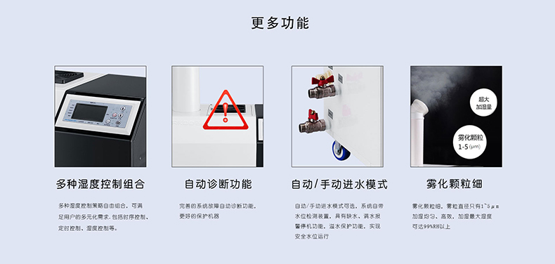 ※ 濕度數(shù)碼全自動(dòng)控制,控制系統(tǒng)配備進(jìn)口濕度傳感器,控制精度高、反應(yīng)迅速。設(shè)定后連續(xù)工作, 無 需人員職守